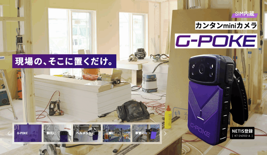 なお、工事現場のような業務での活用を検討中の方には、株式会社MIYOSHIのカンタンminiカメラ「G-POKE(ジーポケ)」 がおすすめです。初期費用0円、月額9,800円(税別)〜のレンタルプランや1週間無料お試しがあり、初期費用を抑えての導入が可能です。現場での安全管理や効率化に役立つG-POKEの詳細は、下記よりご覧ください。