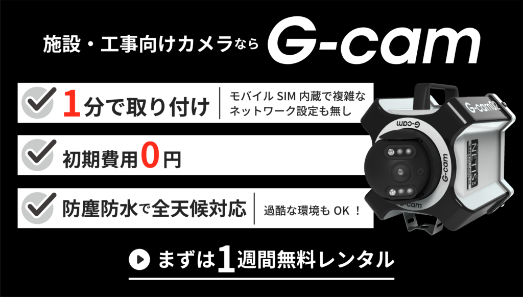 建設現場で使いやすいタイムラプスカメラを探している方におすすめなのが、建設・工事向けのカンタン監視カメラ「G-cam」です。