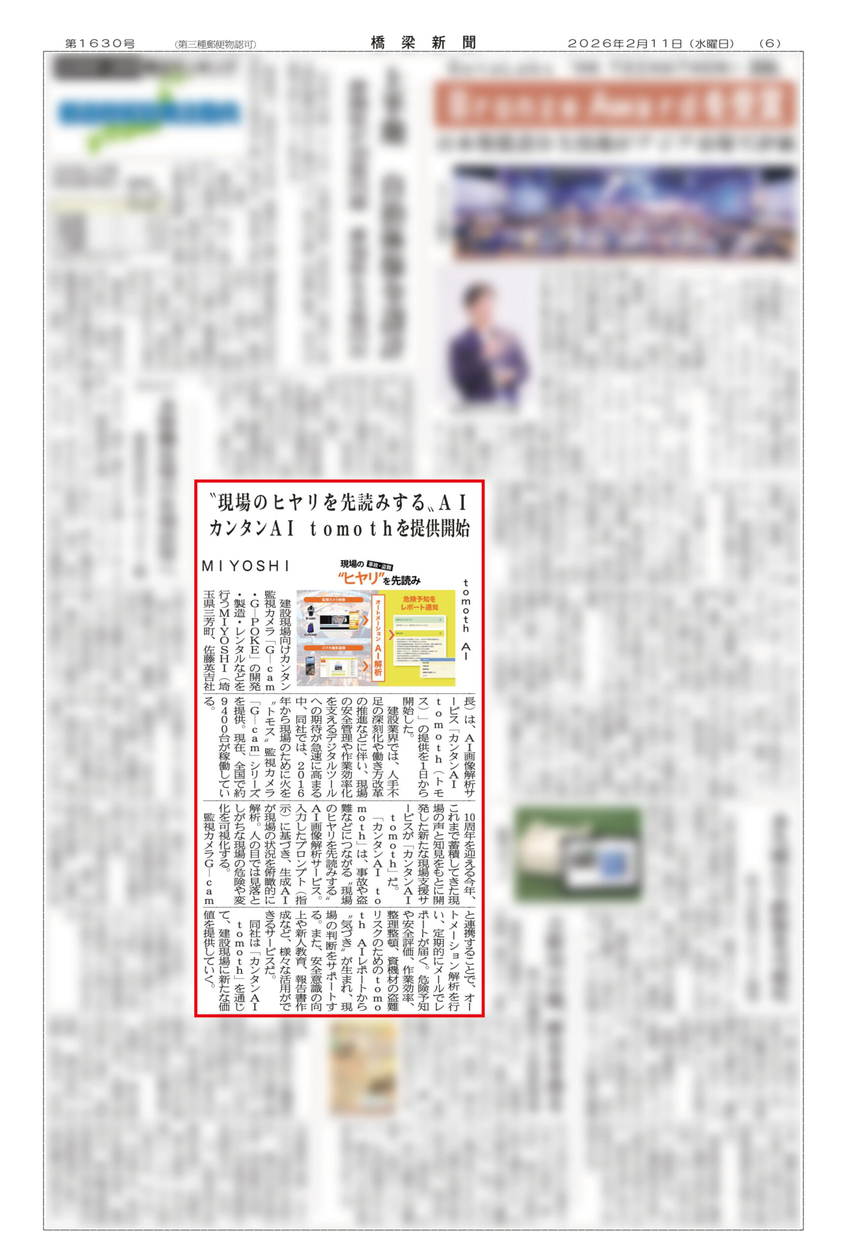 2月11日付けの「橋梁新聞」6面にて、カンタンAI tomoth(トモス)が紹介されました。